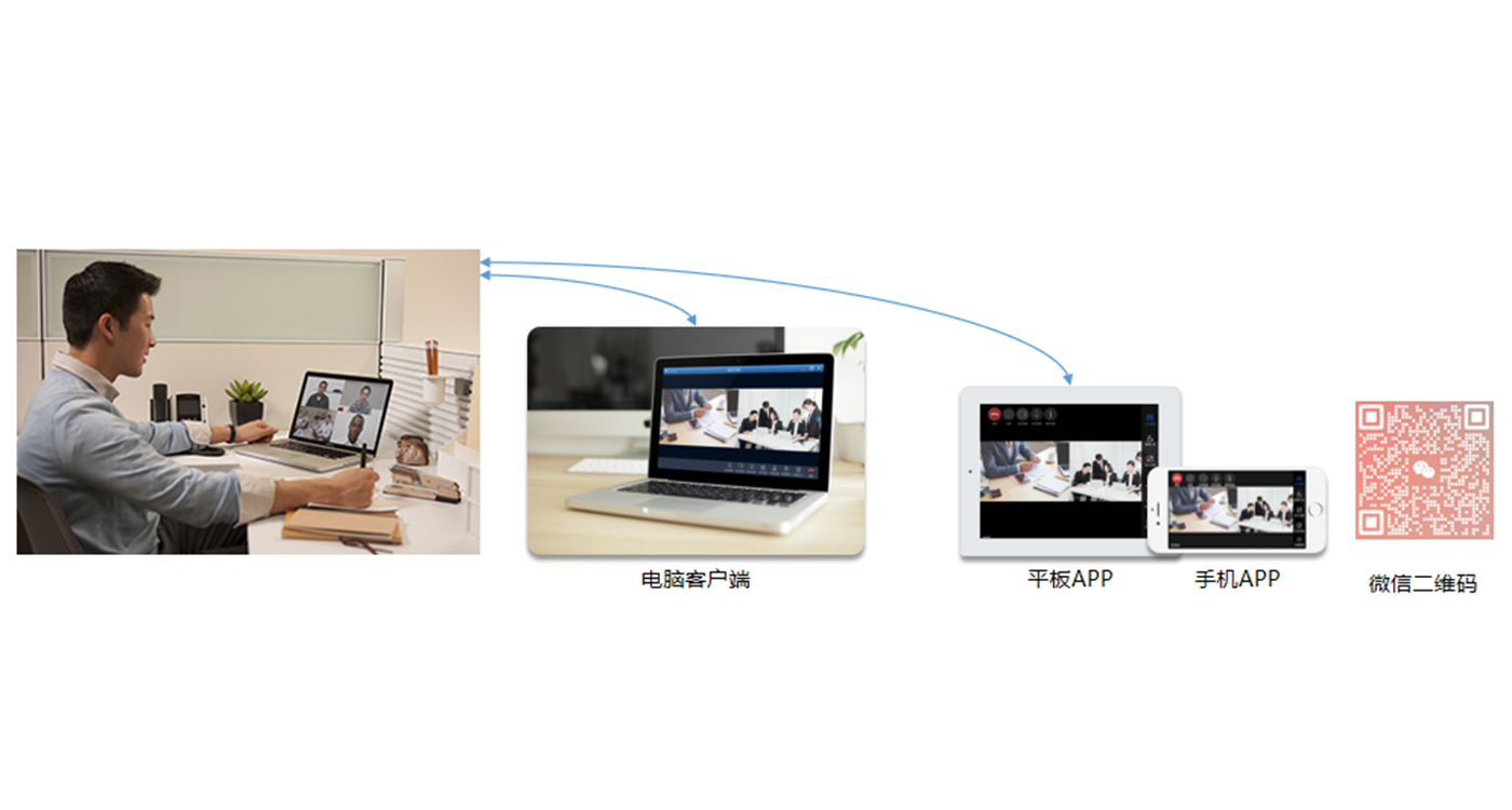 使用方便的桌面办公来适应快节奏的工作,使客户增加与金融各部门的交往时间。可通过个人电脑安装客户端桌面会议终端或者安卓手机、平板以及苹果手机和平板安装APP移动会议终端,支持双流视频会议,可发送、接收PPTPDF等文档视频信号,满足便携式的视频会议业务需求。