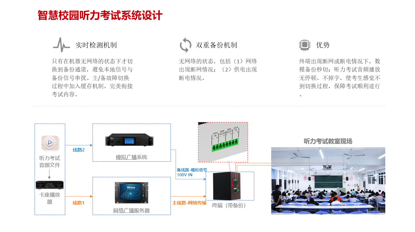 教室壁挂式终端,带有定压备份功能,一旦出现断电或者断网的时候,瞬间转为模拟广播系统的定压输出,定压信号输出到每个教室的壁挂式终端,保证英语听力考试的正常运行。