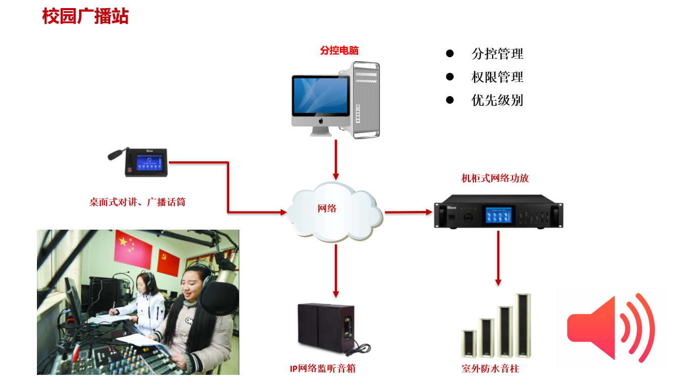 每个教室安装一套壁挂式终端,老师可以自由点播节目库的音源,各个教室之间互不干扰;同时还可以进行本地扩声。