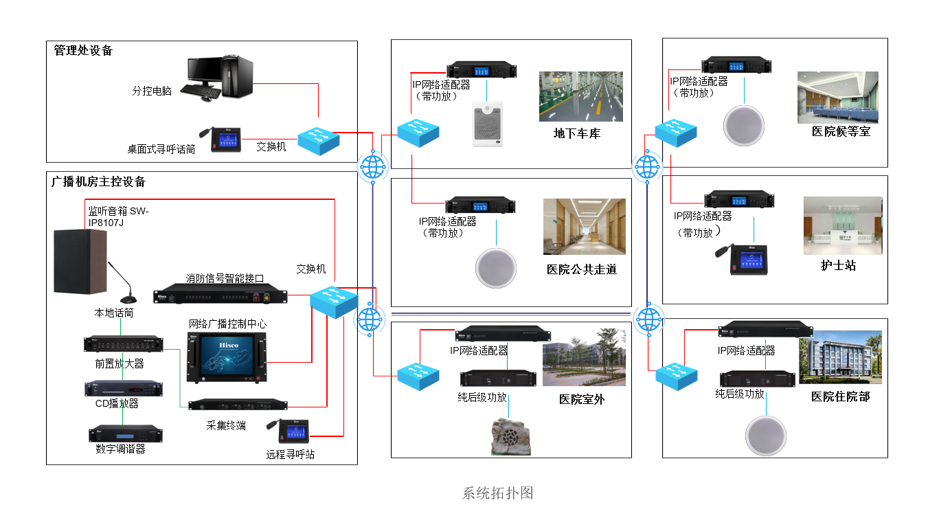 医院可利用广播系统在收治区介绍医院情况,组织架构、值班医生等;服务台利用广播远程寻呼站,进行广播通知、信息播报、寻呼对讲等;