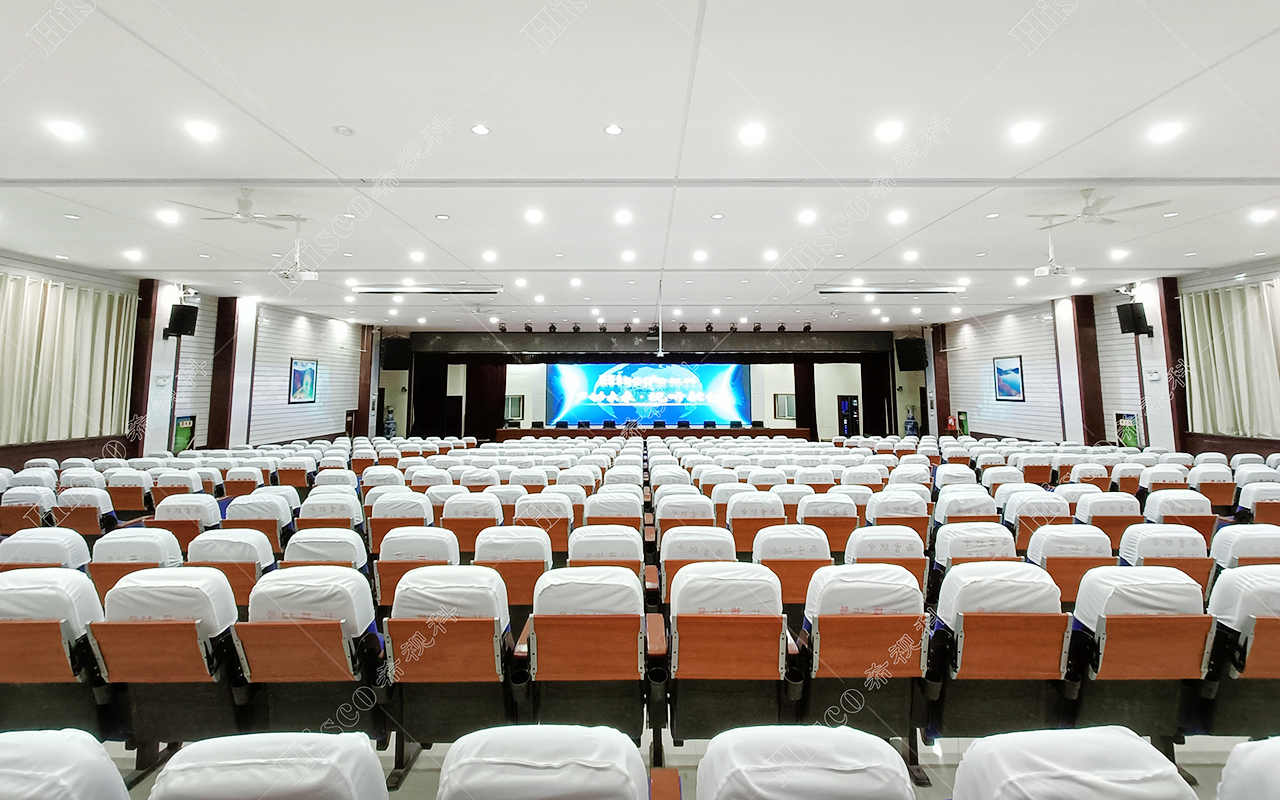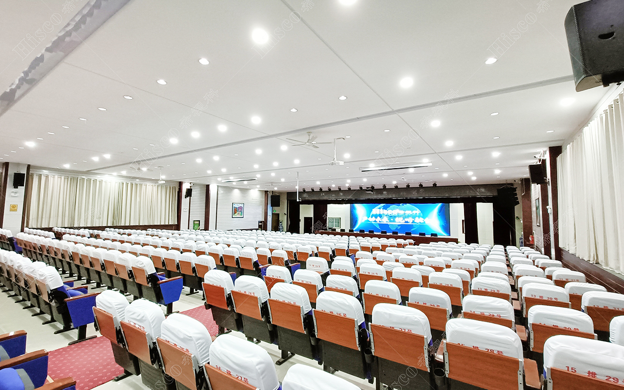本校报告厅是一个中大型报告厅,主要为举办学校学术会议、演讲、公共大课培训及各种文艺演出,根据其建筑结构特点和使用功能及国家相关标准,根据面积和观看距离选择合适的LED大屏,展现整个舞台的宏伟大气;扩声采用集中与扩散相结合的扩声方式,开会和报告时采用单声道集中扩声还原模式,所有音源都从主席台发出,声像的平衡、方位无倾斜,保证了下面学生听到的直达声响度和均匀度达到要求,让学生听的适宜和舒服。演出时采用左右立体声空间成像模式,直达声与辅助音箱的效果声相结合表演,传达表演意境,使得演员和观众之间产生一种无声的交流。