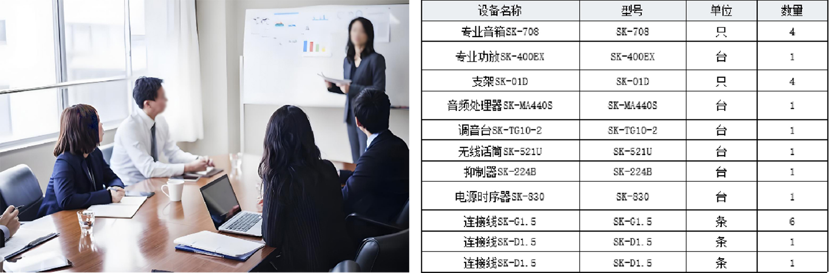 该会议室的配置比较简单,常用于中小型会议室。该会议室要调整声音大小时,就要人离开座位,手动去控制调音台SK-TG10-2推杆;开会时,就要人员打开机柜,拧开钥匙,打开电源时序器SK-830,才能开会。比较繁锁?