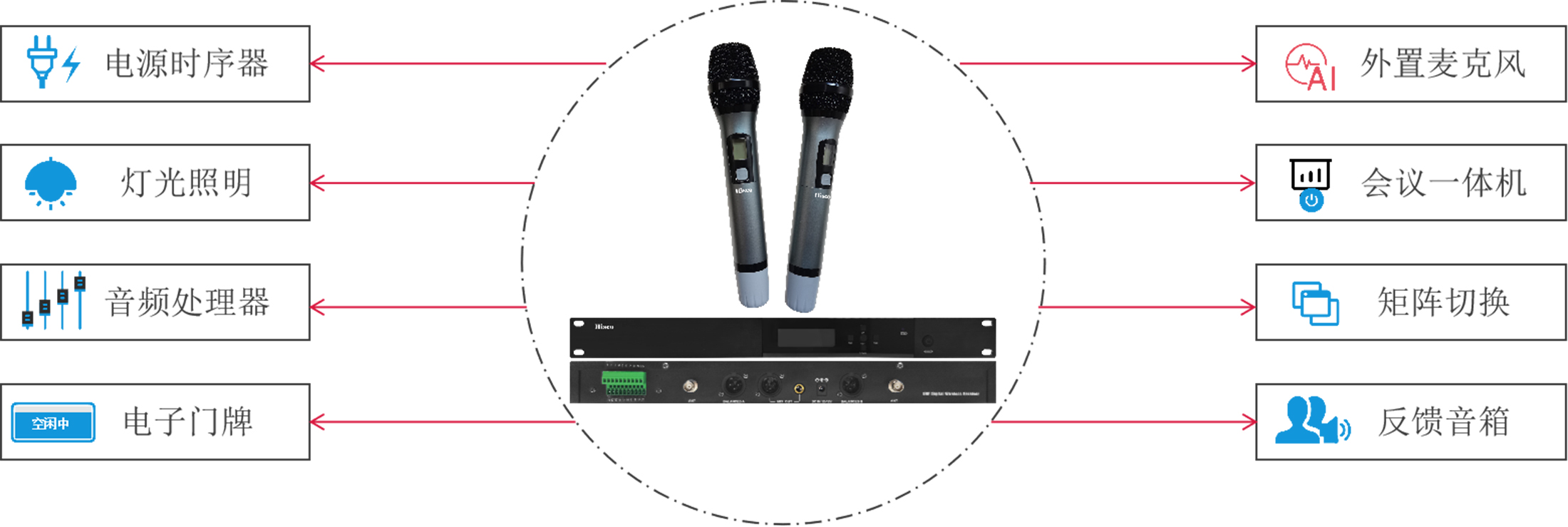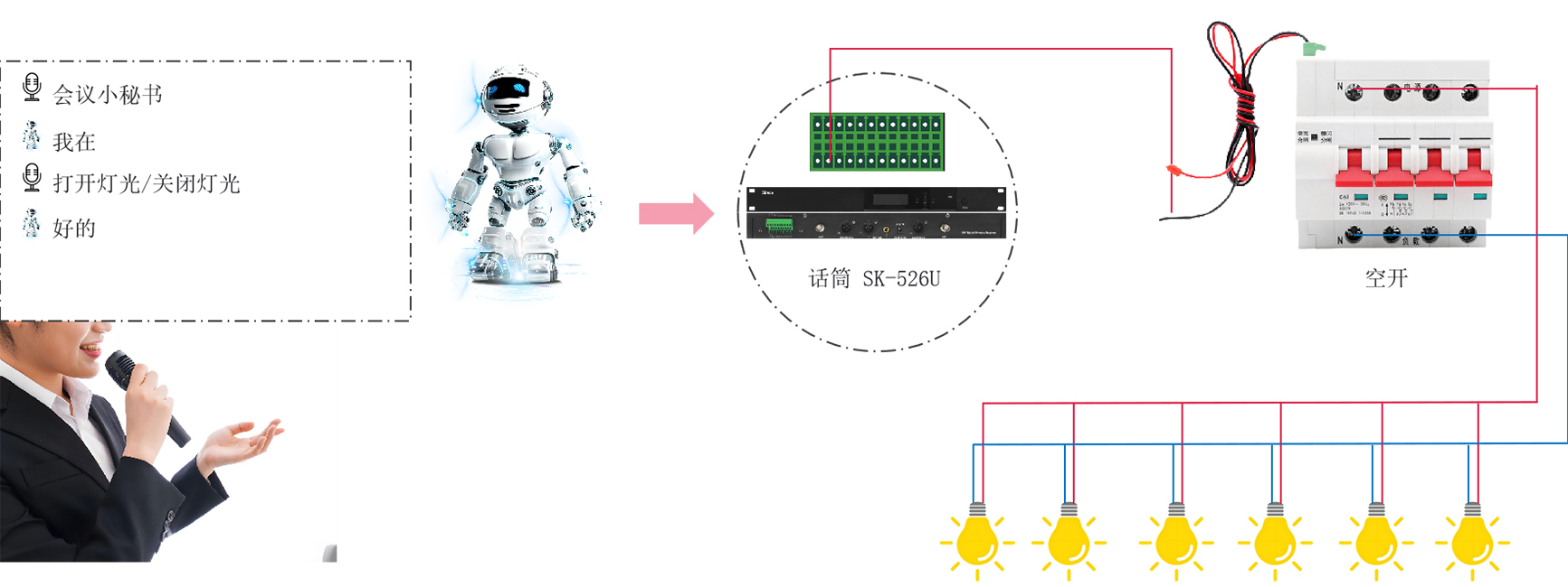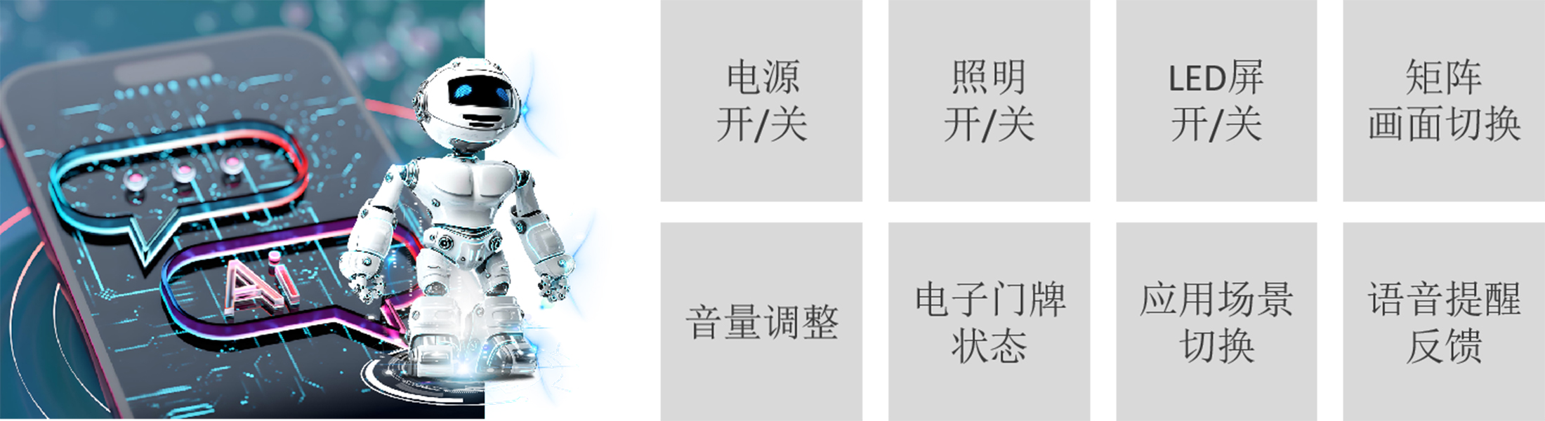 一、集成AI语音模块,支持语音指令控制,通过语音唤醒后,可控制电源、灯光、LED屏、视频切换、音量调整、门口灯牌,场景切换、并带有语音提醒反馈。