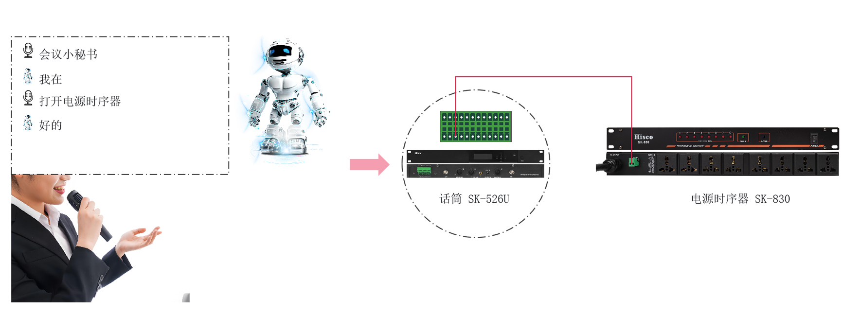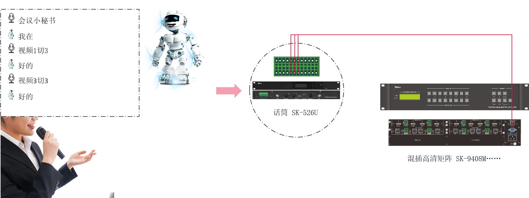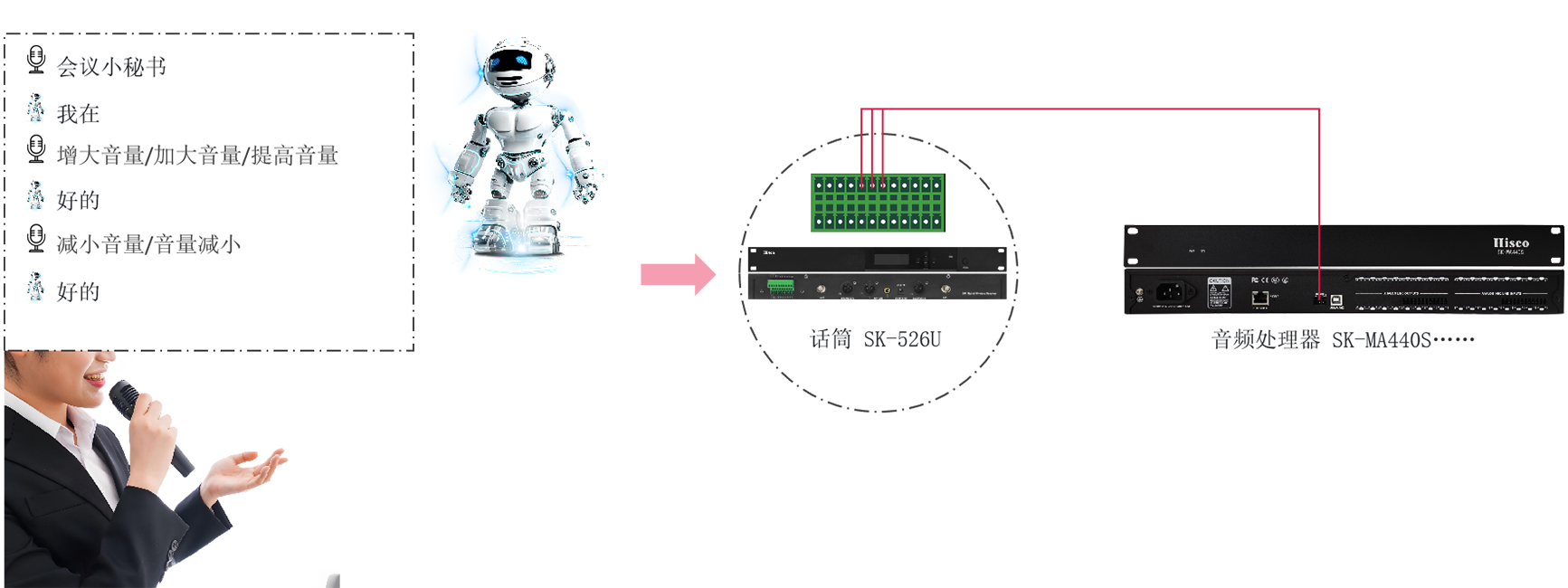 方案配置:SK-526系列或SK-522DM/SK-522LM/SK-522DZ/SK-522LZ+音频处理器(只能搭配矩阵式的,如SK-MA440S……SK-MAL84……不能与SK-RC24P/RC26P/RC28P/PC36P/RC46P/RC48P/SK-213H/SK-211H/SK-212H搭配使用。不能兼容其他厂家的音频处理器。