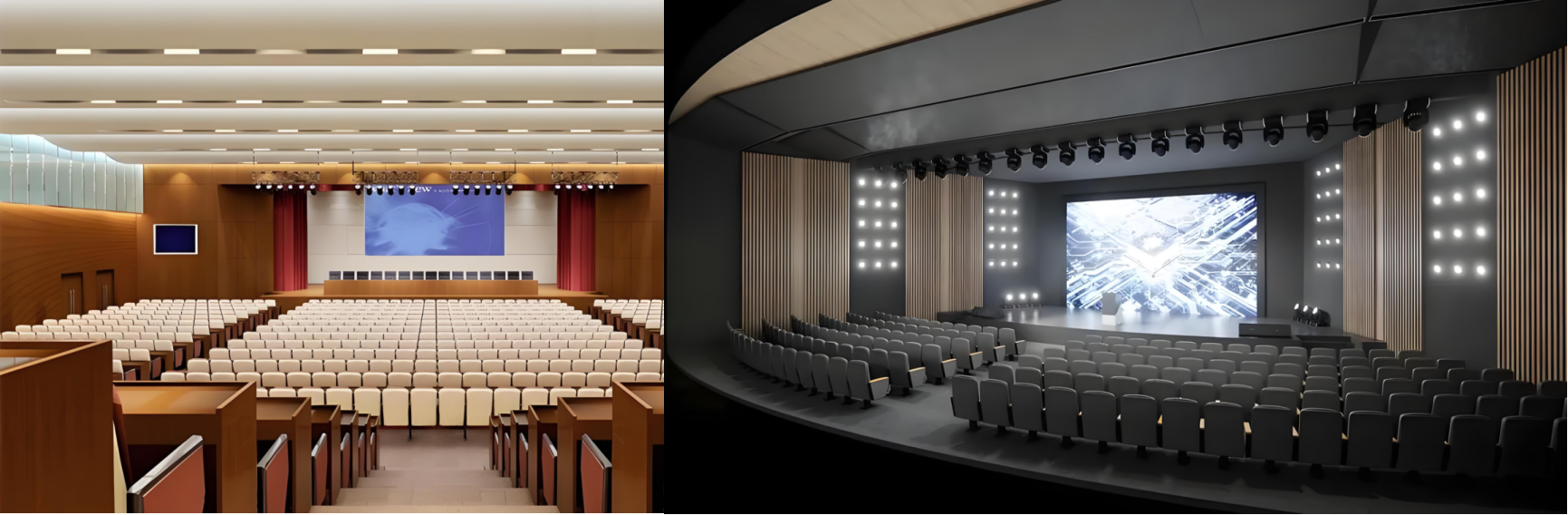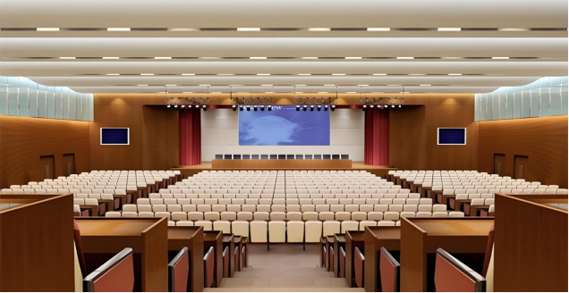 ?环境氛围营造:虽然报告厅的氛围通常偏向正式和专业,但灯光系统依然可以通过调整光线的色温和亮度来营造适宜的学术或商务氛围。例如,使用中性或冷色调的灯光可以传达出专业和严谨的感觉。