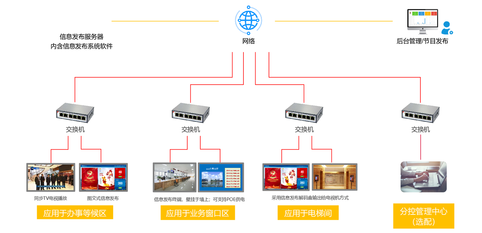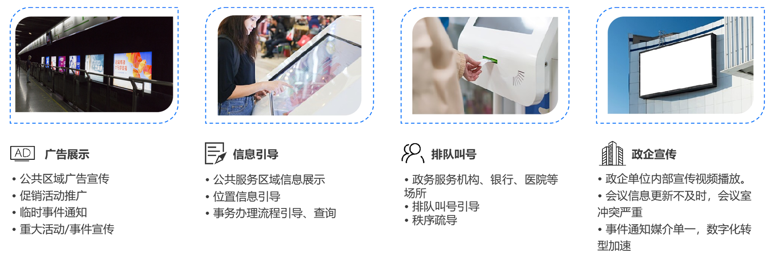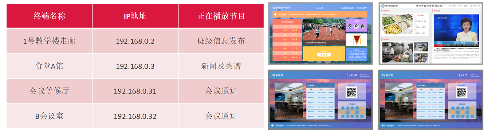 ? 在办事大厅安装若干台显示终端,可根据播放时间设置节目单,播放社会热点推送、国家政策传达、优秀干部竞选、会议培训信息、机密信息审核、岗位招聘、公共服务介绍