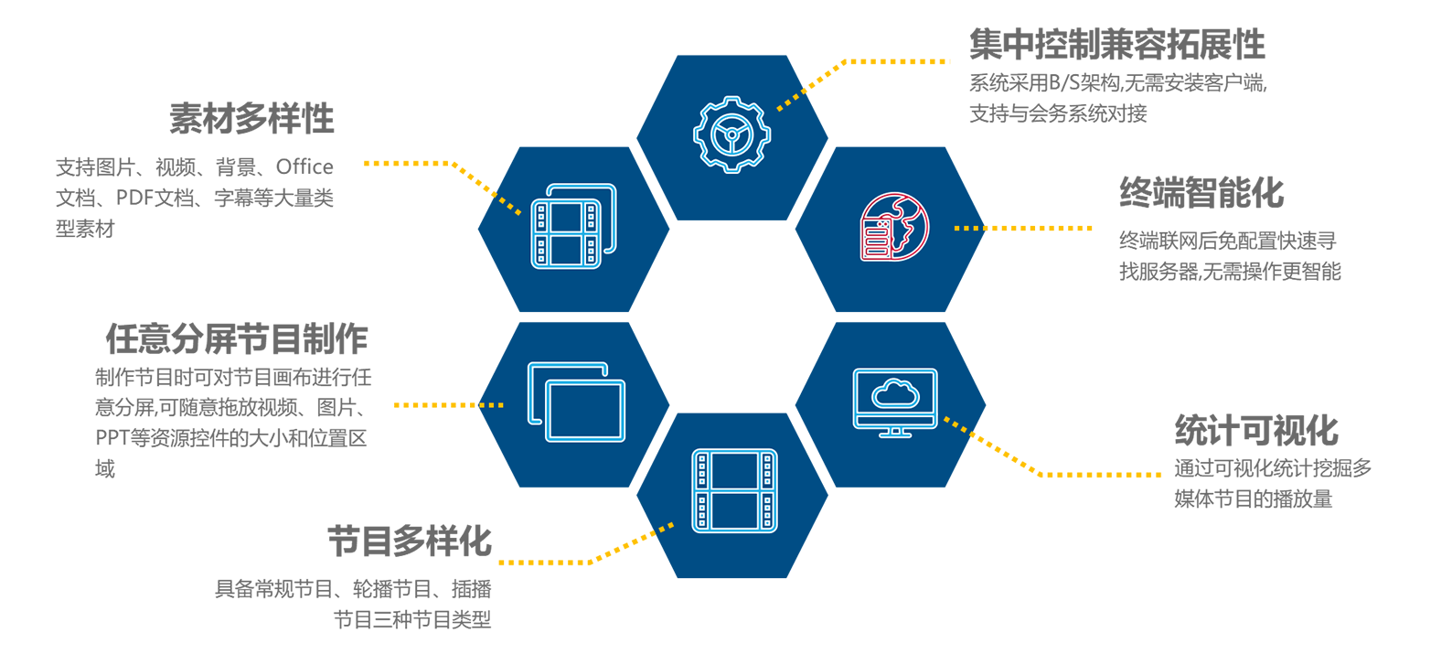 ? 采用“B/S”架构,拥有完美的跨平台解决方案,支持私有云/公有云部署,分布式区域管理技术,有效整合各种多媒体资源。