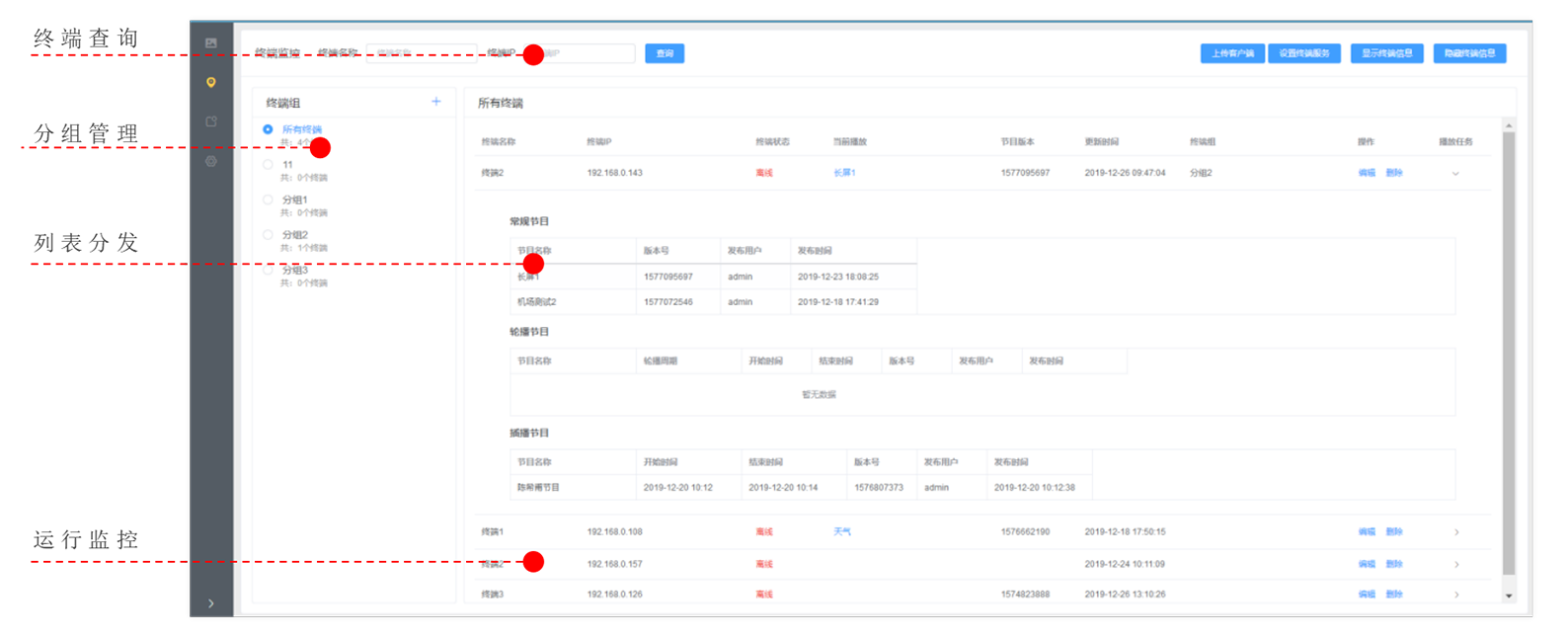 ? 支持对信息发布终端进行分组归类,不同组播放不同的内容,相同组内终端播放内容一样。