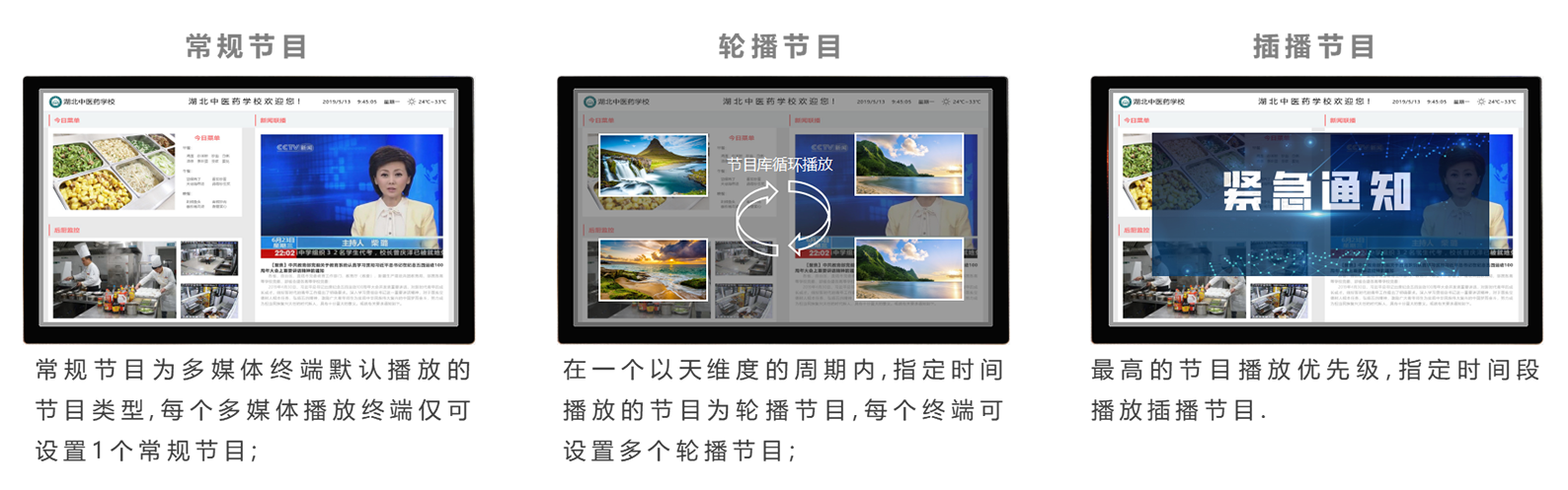 ? 支持多种节目播出方式:普通发布、循环播放、定时播出、即时插播等。