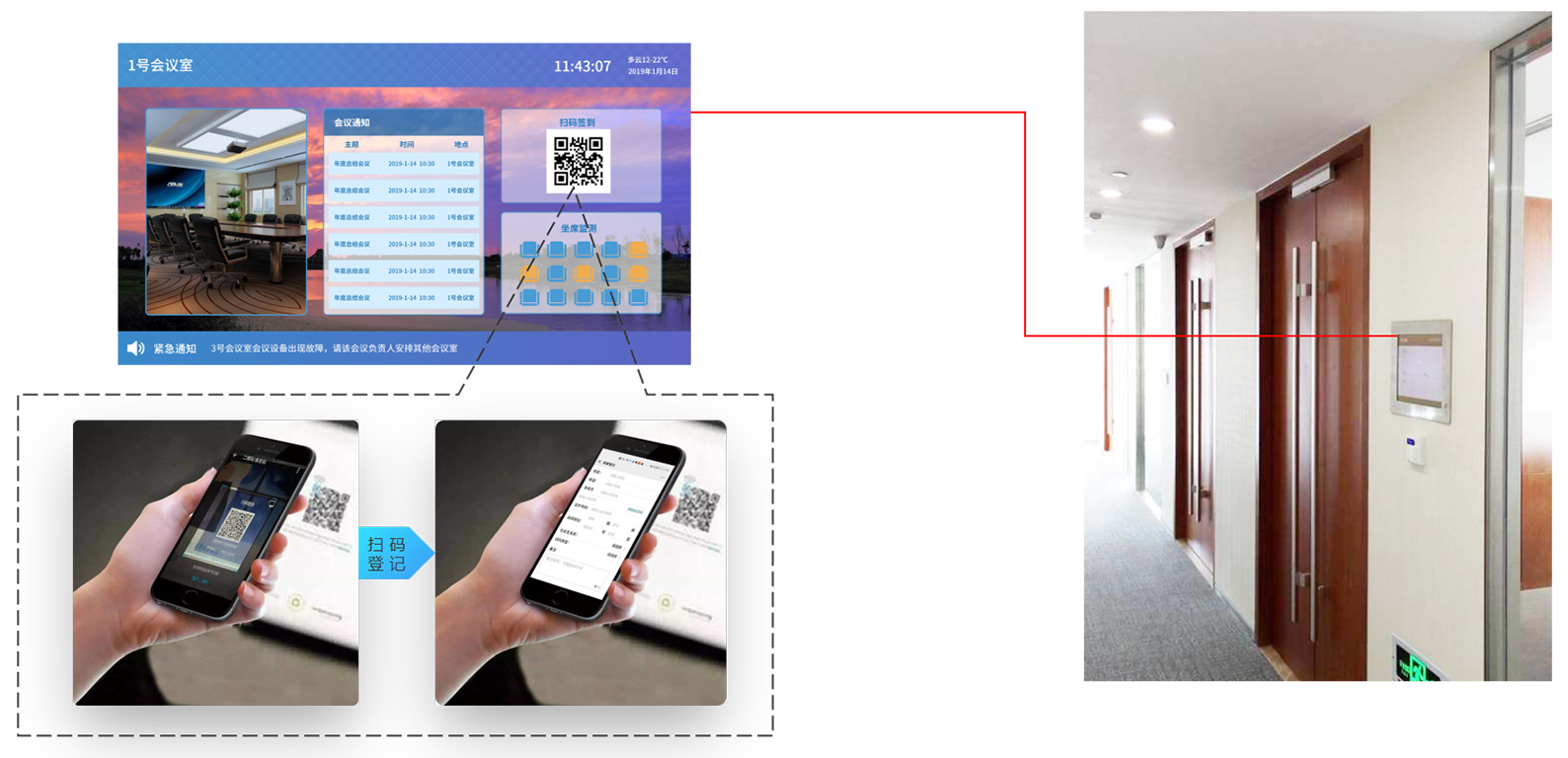 终端软件节目中可嵌入外部资源,也可将外部资源生成二维码;通过手机端扫描节目中的二维码,支持访客登记,资源下载等功能。