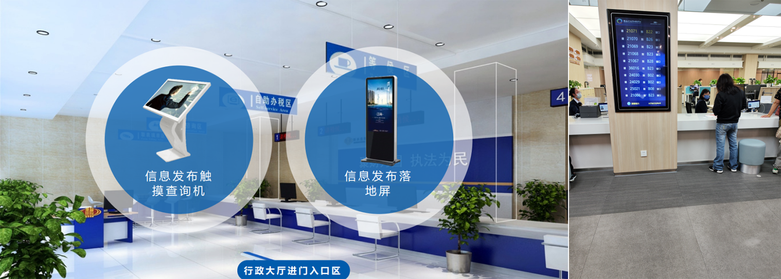 ? 发布显示行政中心风采、宣传册等,与排队叫号系统对接,实时同步显示当前窗口区叫号信息、办理事项及进度