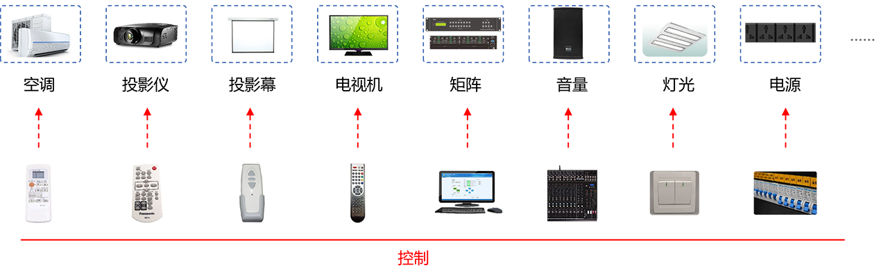 在会议室中,会有众多的设备需要控制,例如:
