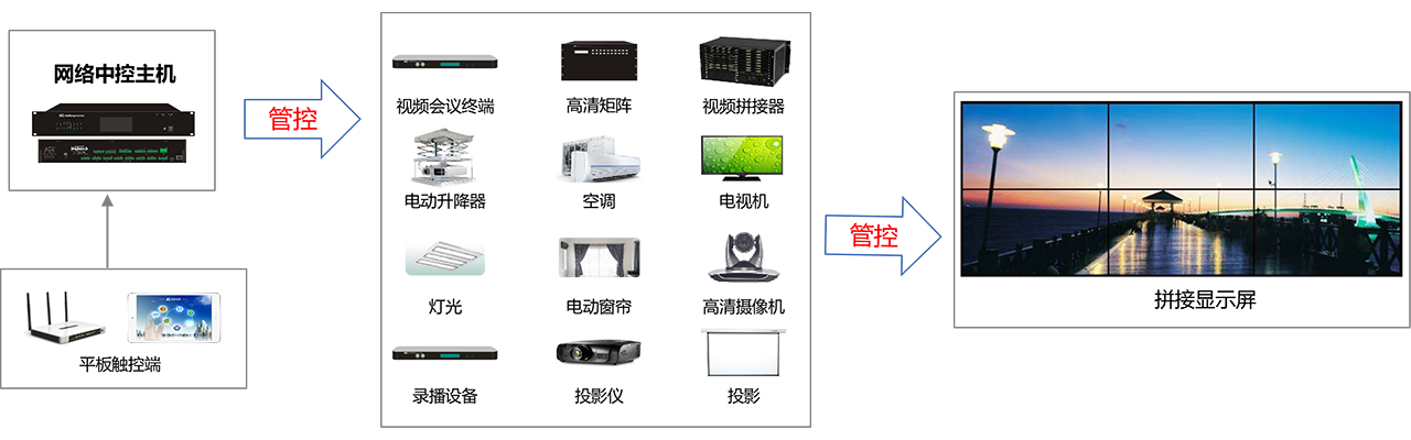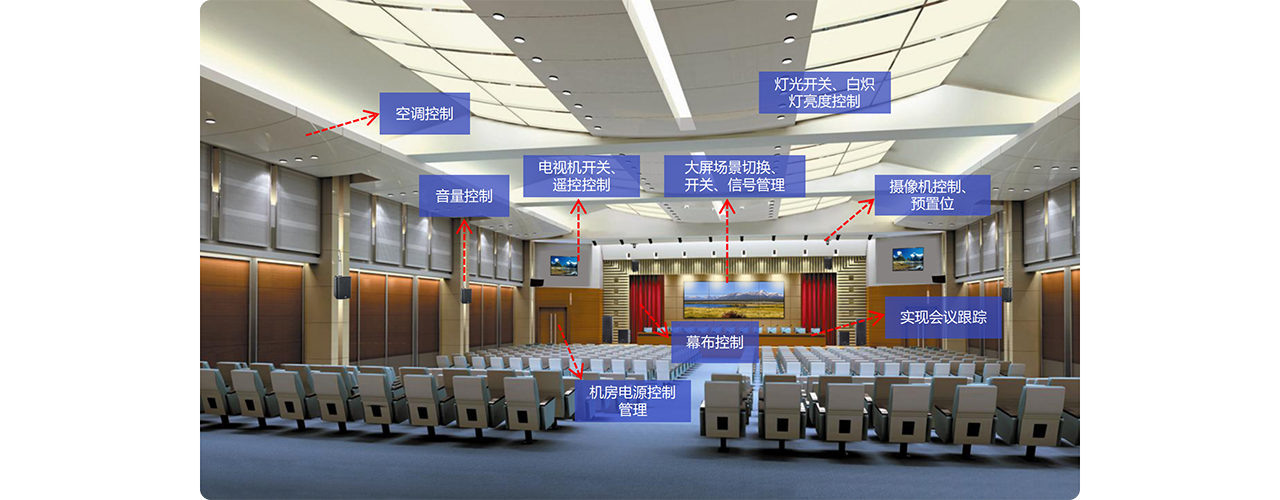 实现对会议室的集中管控;包括环境控制(空调温度控制、窗帘控制、灯光亮度调节)、摄像机和投影机控制、投影幕和吊架升降控制、音视频切换控制、音量大小调节等功能……