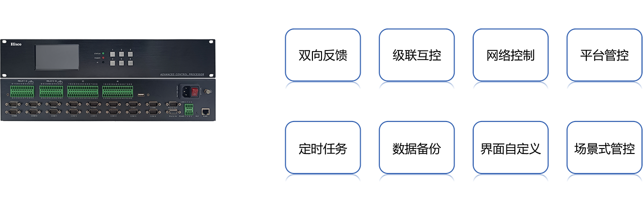 ? “音响调音、显示信号切换、机房电源开关,自定义场景,如一键切换为“演示模式”。