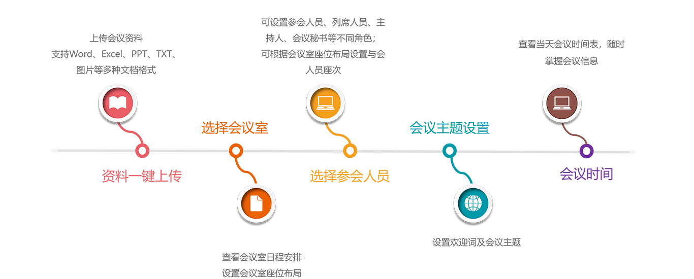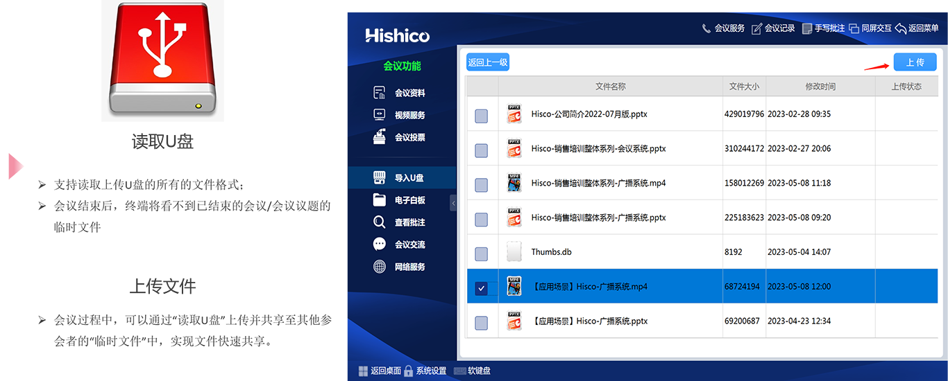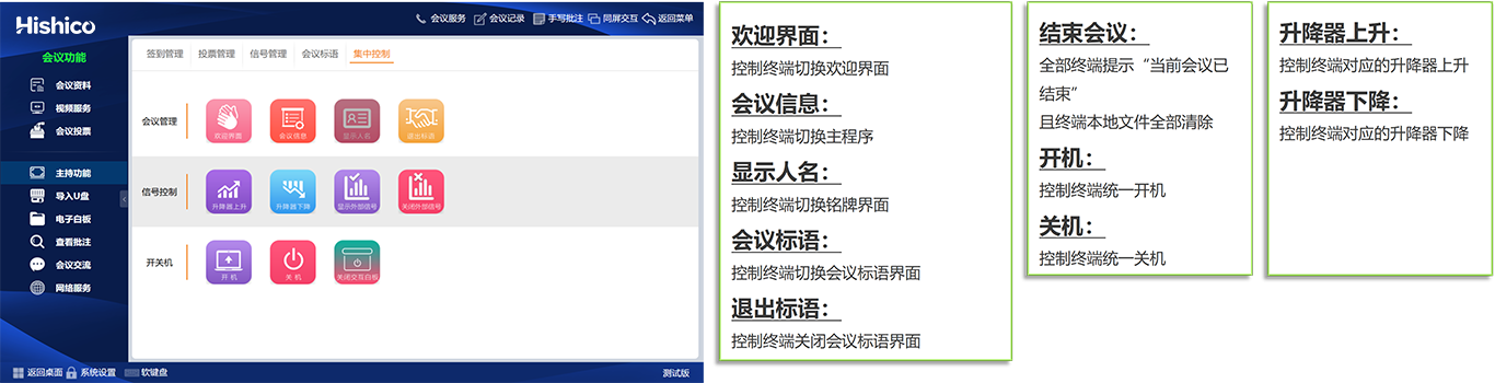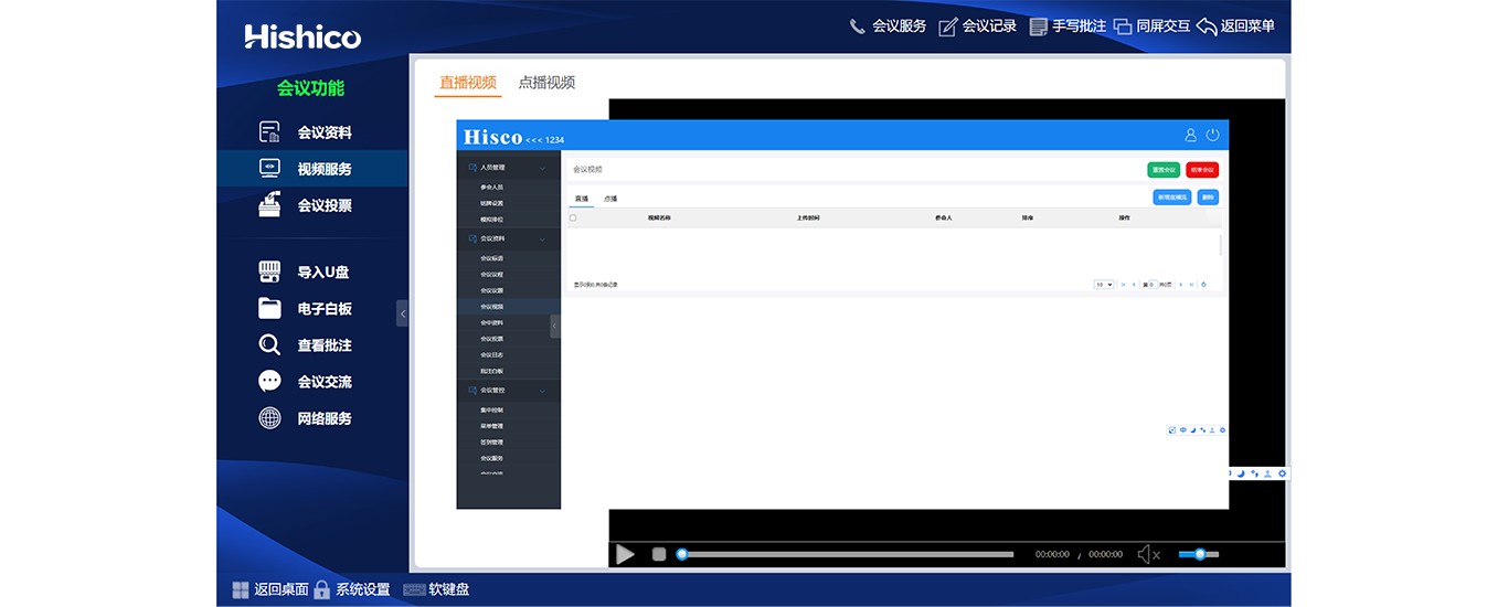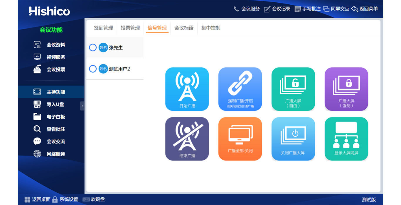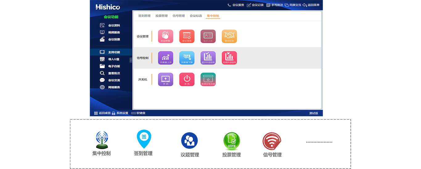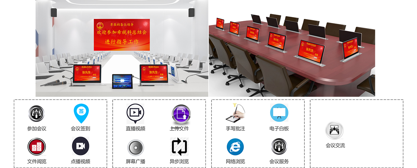 ? 会议功能全面覆盖,会议签到/会议信息/会议文件/会议现场/会议记录/电子白板/交流提示/网络浏览/U盘导入/会议投票/视频点播、直播/PC模式/主持功能/中控功能