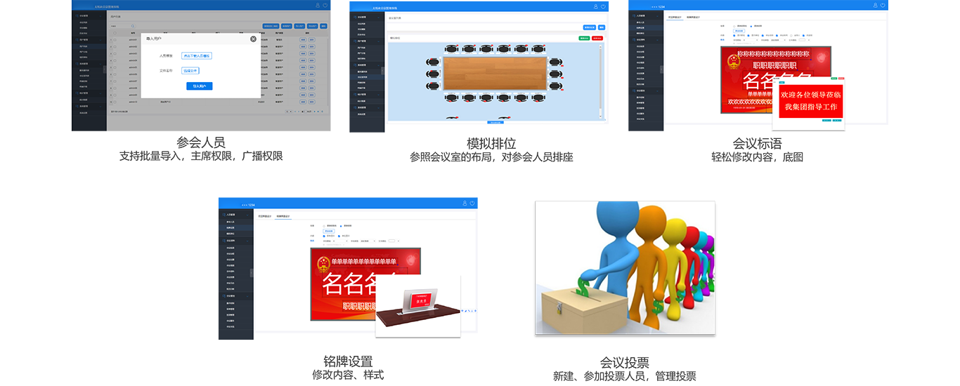 ? 后台管理强大灵活,权限管理/首页格式/主界面管理/系统设置/桌签格式/多会议室定义/多会室预设/与会者管理/文件管理/投票管理/视频管理/会议安排表/会议存档
