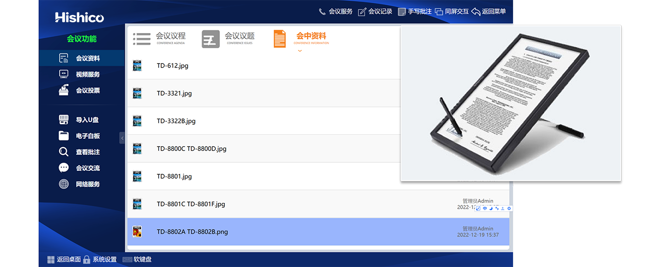 无纸化会议系统,组成包括平板电脑(或者PC电脑),路由(支持企业无线路由),服务器(或普通PC机)三大部分。其会议中使用的文件全是采用电子档, 开会过程中每个坐席均配有升降器,与会者可以在升降器上查看会议的相关信息,例如会议简介,会议议题,参会人员等,也可以查看会议相关的文稿(主要是PPT,Excel,Word,PDF等办公文档),当你需要主持某个文档的演讲时,可以发起同屏,让每个坐席都能同时看到你对这文档的操作,比较你对文档的翻页,放大缩小,或者批注文档,这是传统的会议无法做到的。