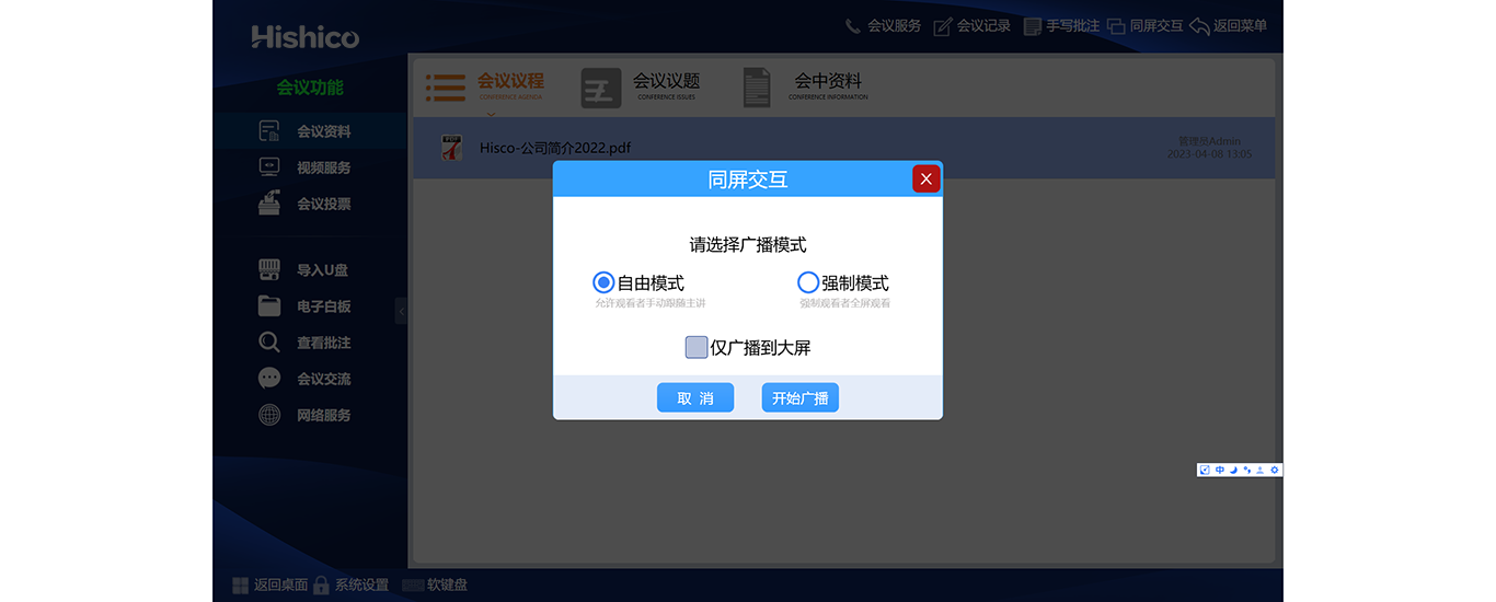 ? 屏幕广播:参会者可以将本会议终端的内容显示发送至其他参会者终端及会场大屏幕,实现实时屏幕广播