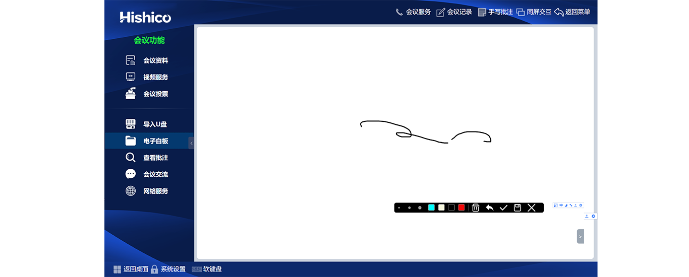 任意界面批注:会议过程中,点击【手写批注】,可对任意页面进行截屏手写批注,并只可以保存至服务器