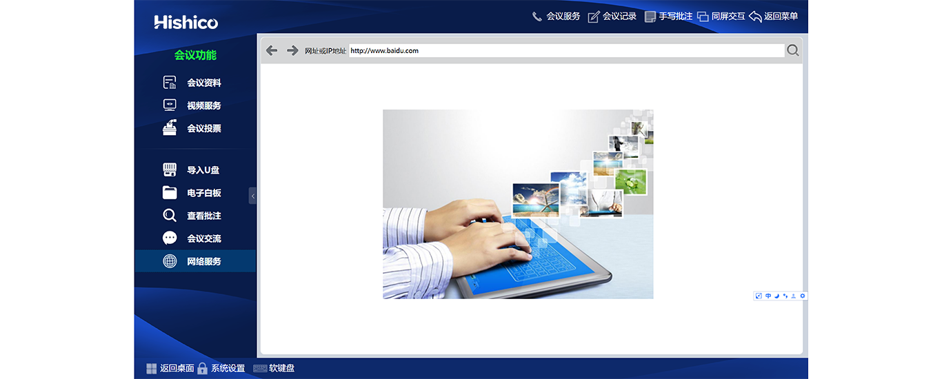 客户端内置浏览器:无纸化系统内置浏览器功能,会议过程中,参会者可以通过“网络浏览”界面查询相关资料