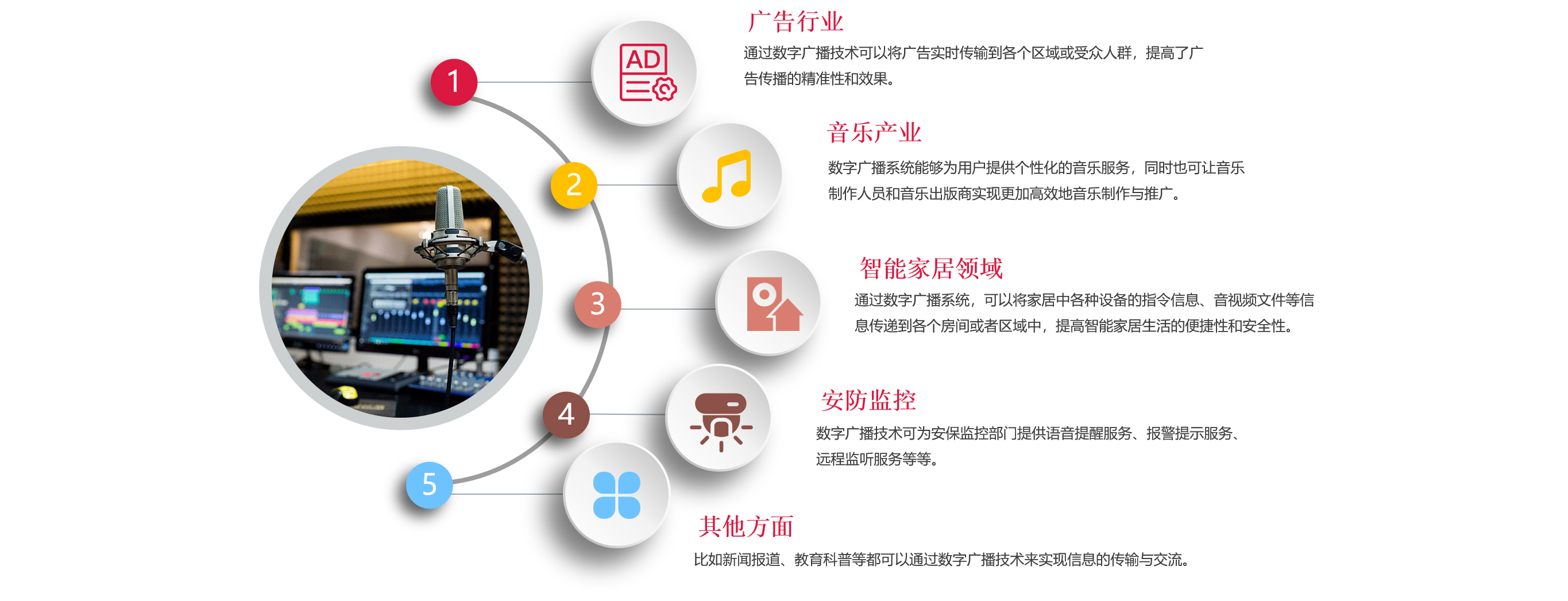 1.数字广播系统:数字广播系统支持多种音频格式转换、多通道混音等高级功能,可满足不同应用场合的需求,例如音乐播放、新闻播报等。同时,数字广播系统还可以实现实时交互和远程监控等功能。